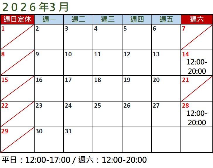 *2026年3月營業時間公告* 1.週一至週五:12點至17點 2.